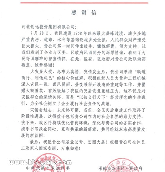 近日,承德市雙灤區(qū)區(qū)委、區(qū)政府向河北創(chuàng)遠投資集團發(fā)來感謝信,對創(chuàng)遠集團在今年抗洪搶險期間第一時間伸出援手、與區(qū)委、區(qū)政府和當?shù)厝罕婏L雨同舟的深厚情誼,表達了誠摯的感謝。